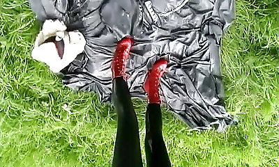 Curvy Cougar in a leather skirt and long boots masturbates outdoors without taking off her pantyhose