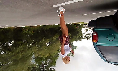 Blonde in high heels faps with a dildo stuck to the car