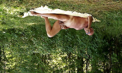 Pussy masturbation fantastic brunette Cougar on naughty beach by lake outdoors. Nude beach. Fingering wet pussy orgasm squirt